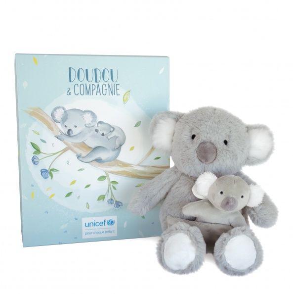 Peluche Koala Doudou et compagnie en partenariat avec l'UNICEF, vendue dans une jolie boîte.