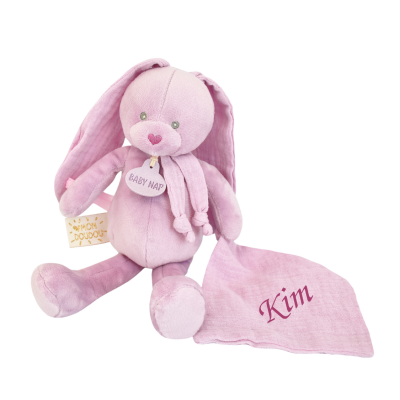 Peluche avec doudou lapin lange violet de 25 cm, personnalisable. La personnalisation du doudou se fait sur le carré au bout du bras.
