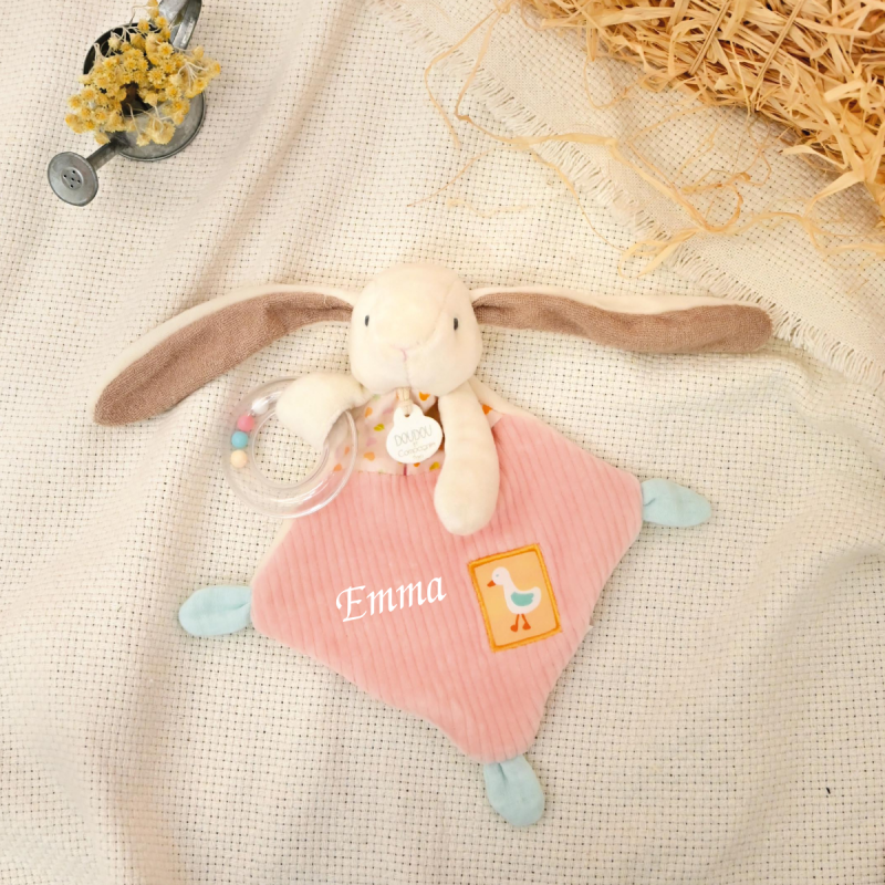 Superbe doudou avec hochet Ciboulette le lapin, personnalisable. Vendu dans une jolie boîte. 20 cm.