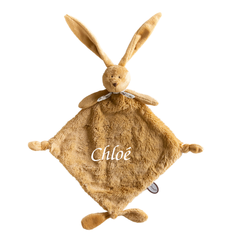 Grand doudou personnalisable Flo le lapin jaune moutarde de 35 cm.