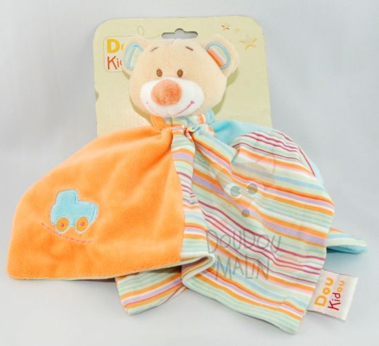 Doukidou doudou plat carré ours orange bleu vert rayé voiture