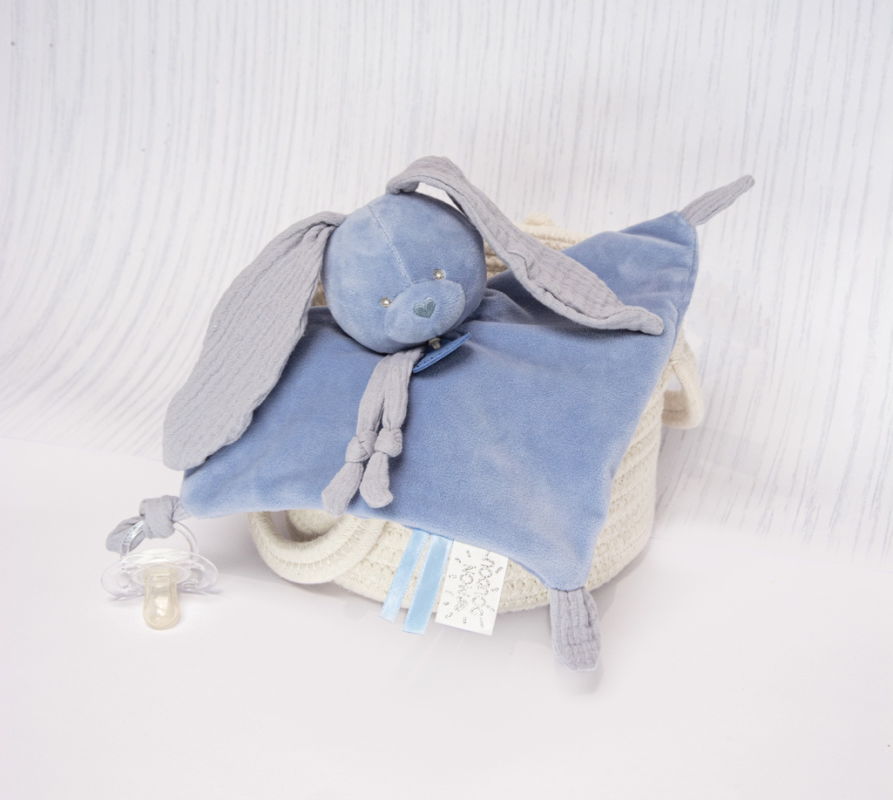 Doudou lapin lange bleu de 25 cm, personnalisable.