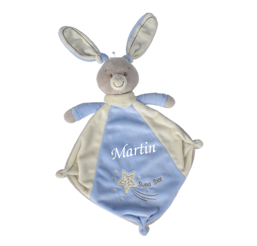 Doudou lapin bleu Nicotoy de 35 cm à personnaliser