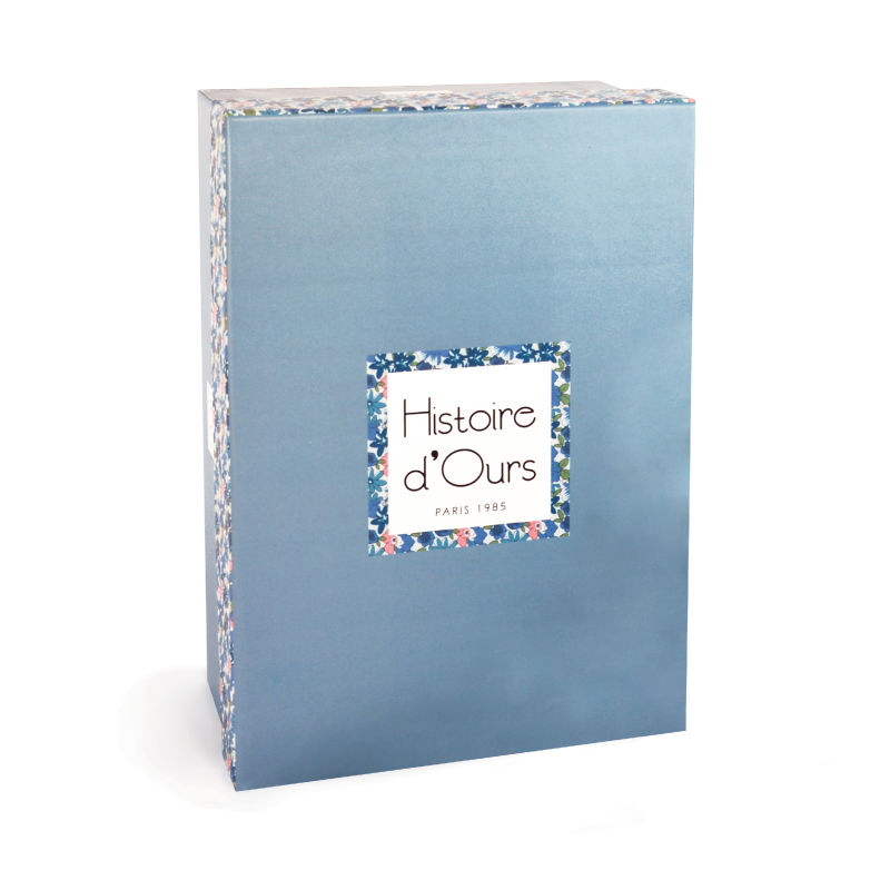 Magnifique peluche lapin bleu toute douce avec ses notes de liberty, vendue dans une jolie boîte. le cadeau parfait ! 25 cm