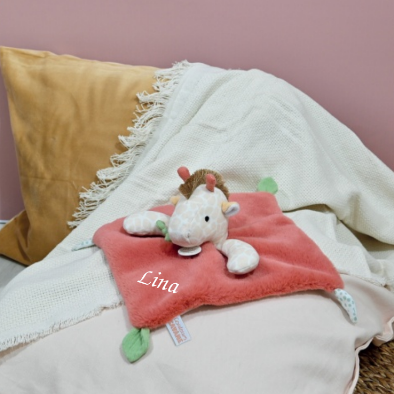 Doudou plat girafe à personnaliser de la collection Couleurs Savane de Doudou et compagnie, vendue dans une jolie boîte ouverte. 25 cm. Très doux !
