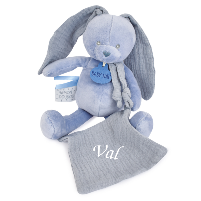 Peluche avec doudou lapin lange bleu de 25 cm, personnalisable. La personnalisation du doudou se fait sur le carré au bout du bras.