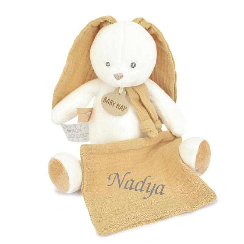 Peluche avec doudou lapin lange moutarde blanc de 25 cm, personnalisable. La personnalisation du doudou se fait sur le carré au bout du bras.