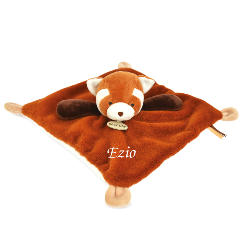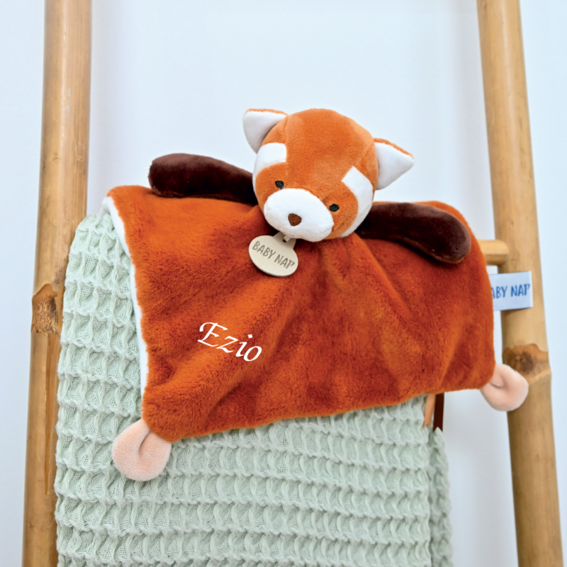 Doudou panda roux à personnaliser, tout doux. Le doudou a des poils longs ce qui peut gêner la visibilité de la broderie surtout avec une écriture fine telle que Calgary.