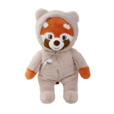 Peluche panda roux avec capuche amovible, la personnalisation se fait sur un bandana blanc noué autour du cou de la peluche.