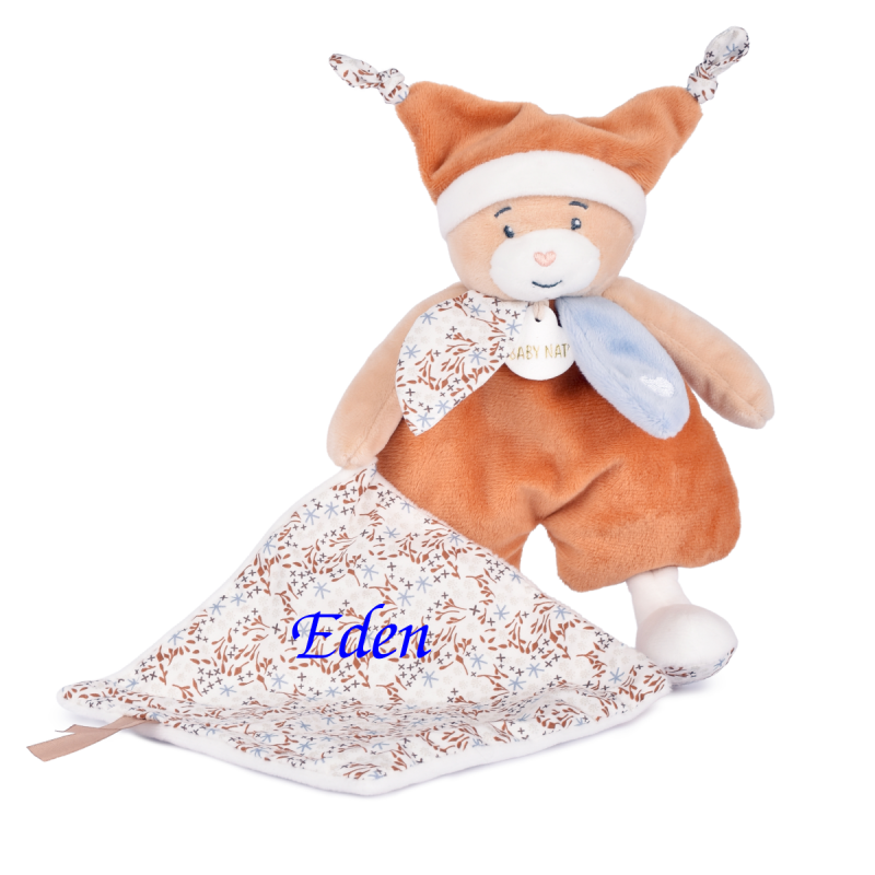 Polochon l'ours peluche de 18 cm + doudou de 12 cm dans de magnifique couleurs orangé et bleue Personnalisable avec une jolie broderie.